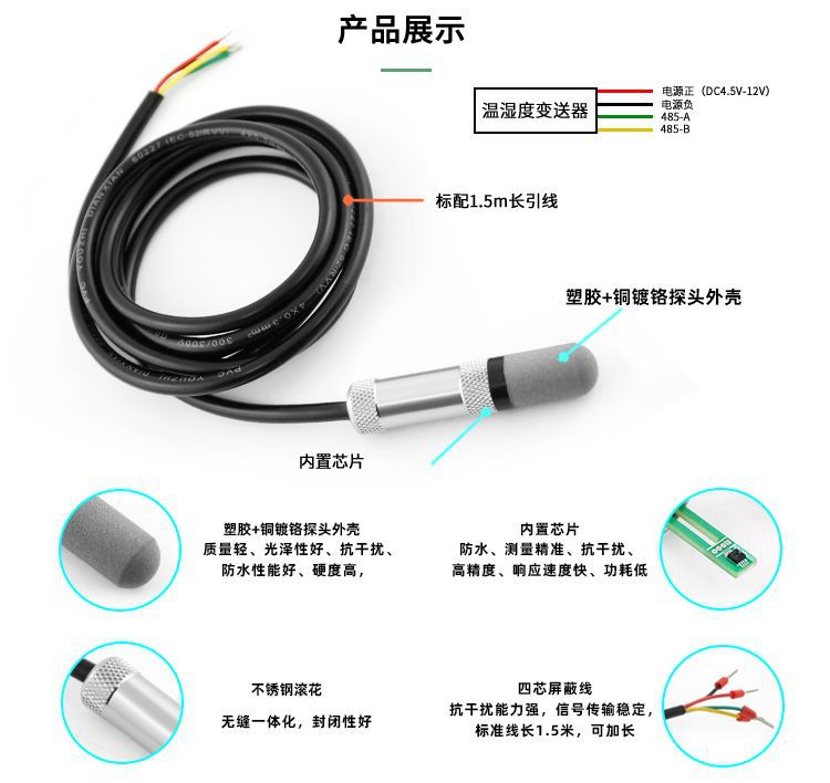 RS485一體溫濕度變送器采用進(jìn)口RHT系列溫濕度傳感器,探頭部分采用塑膠材質(zhì)防水性能好,質(zhì)量輕,外殼采用銅鍍鉻材料,硬度高,光澤性好,物美價(jià)廉。